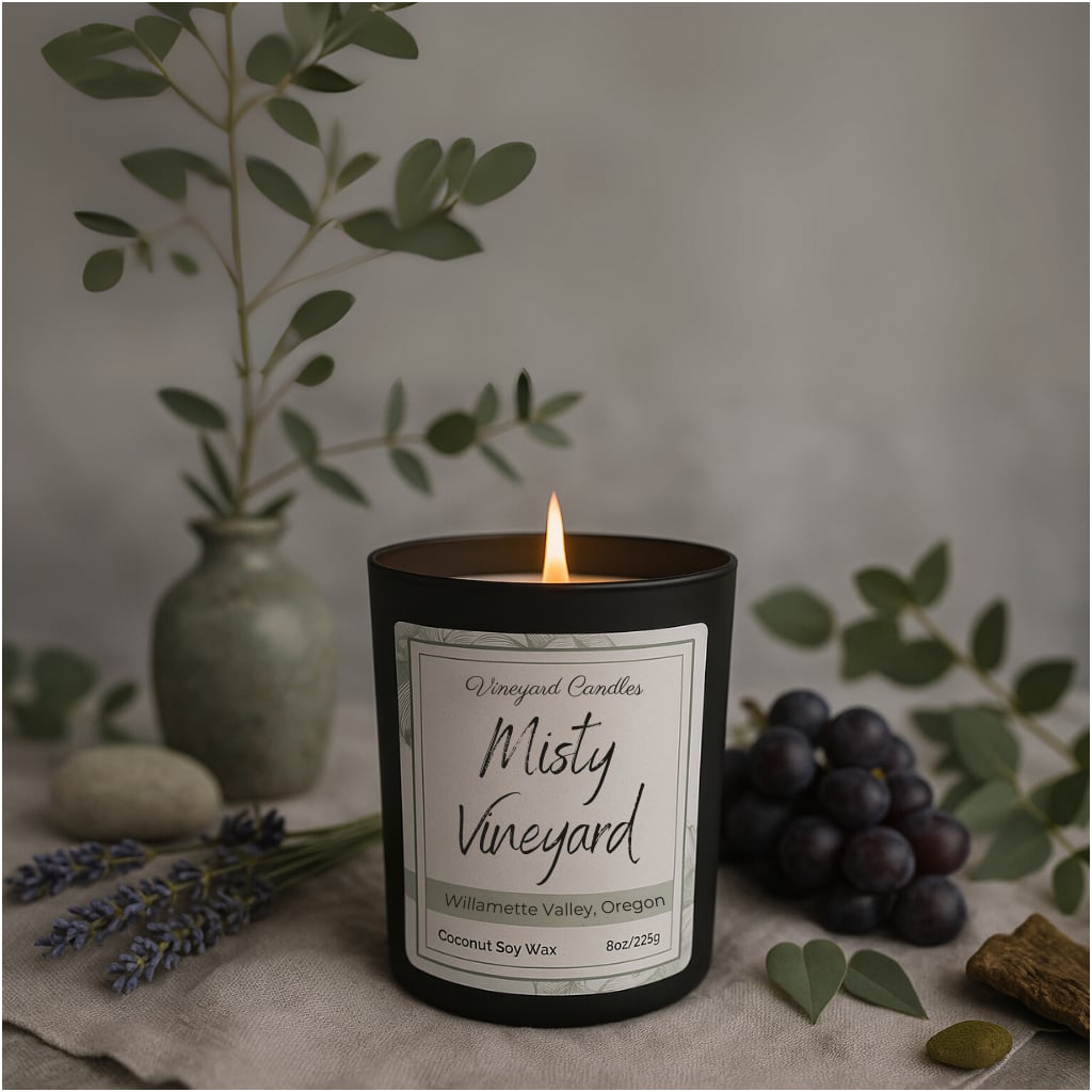 Misty Vineyard captures the serene, early-morning stillness of wine country, where cool fog lingers over the vines and the earth breathes deep. It opens with the soft sweetness of stone fruit and crisp green leaves—fresh, dewy, and full of promise. The heart reveals an earthy blend of leather, patchouli, and cedar leaf, evoking rows of aged barrels and the warmth of seasoned wood. Finished with smoky vanilla and dark woods, this scent is grounding and graceful—like the vineyard itself, calm and cloaked in morning mist. Rooted in earth.